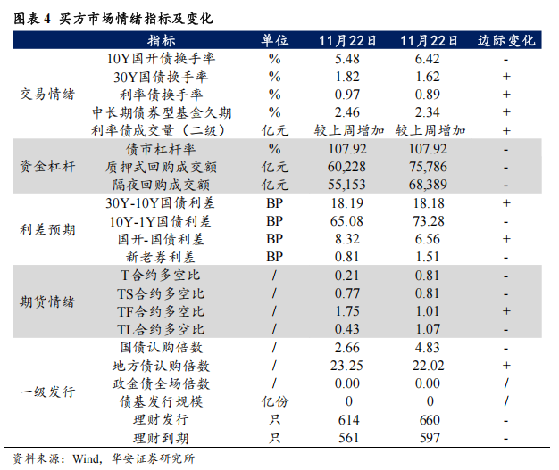 完了11月29日,买方商场形态指数录得0.58,较11月22日下跌。咱们统计了四大类的债市形态目的,交游形态与资金杠杆方面,本周债市换手率举座下跌,银行间债市杠杆率、质押回购成交额、隔夜回购成交额下跌;利差方面,收益弧线呈牛平形态,30Y-10Y国债利差、国开-国债利差走阔,10Y-1Y国债利差、新老券利差收窄;期货形态方面,T主力、TS、TL合约成交多空比下跌,TF合约成交多空比飞腾;一级商场方面,国债认购倍数下跌,所在债认购倍数飞腾,搭理的刊行量、到期量下跌。