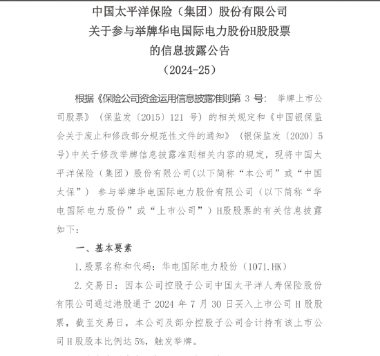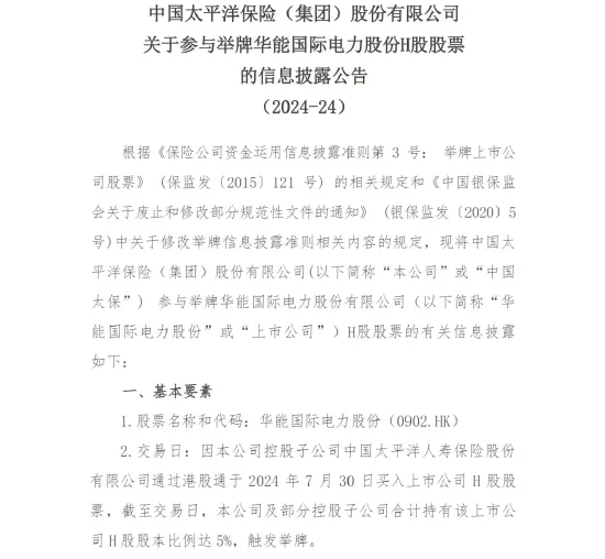 从公告信息来看,因中国太保控股子公司中国太平洋东谈主寿保障股份有限公司通过港股通于2024年7月30日分辨买入华电外洋和华能外洋H股股票,畛域交畴前,中国太保及部分控股子公司测度握有的华电外洋和华能外洋H股股本比例分辨达5%,触发对两家公司的举牌。中国太推选牌华电外洋和华能外洋H股均是使用自有资金。畛域2024年3月31日,中国太保总钞票约24414.19亿元,净钞票约2762.71亿元。